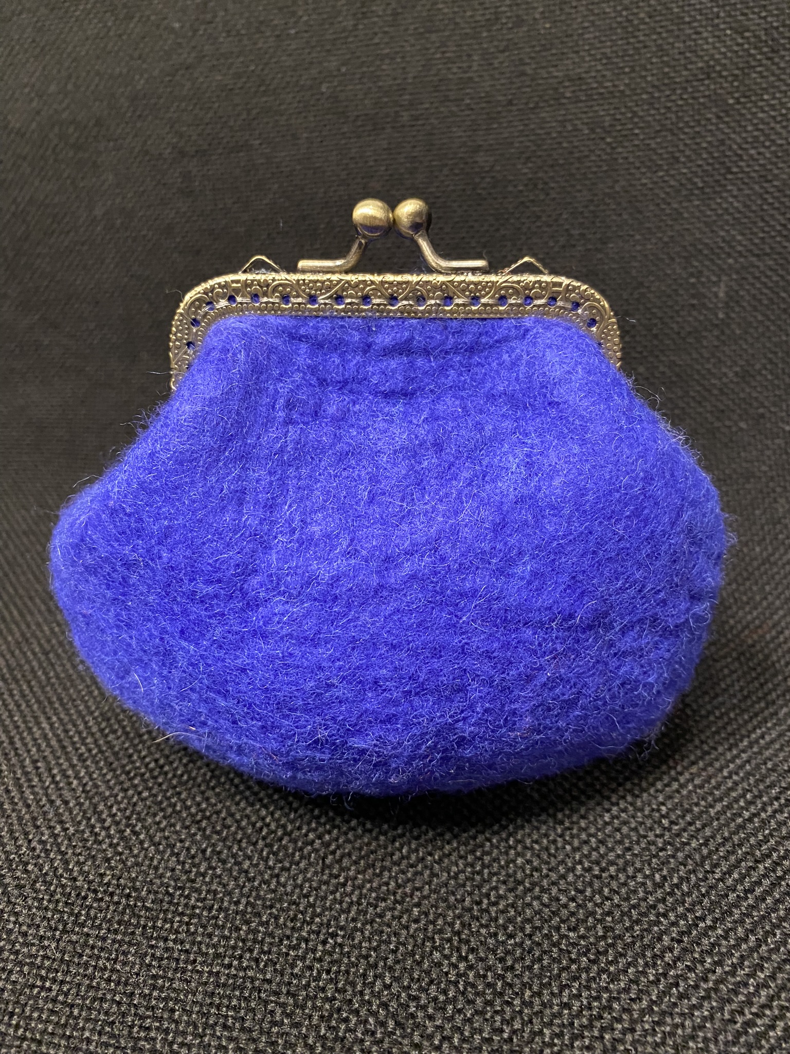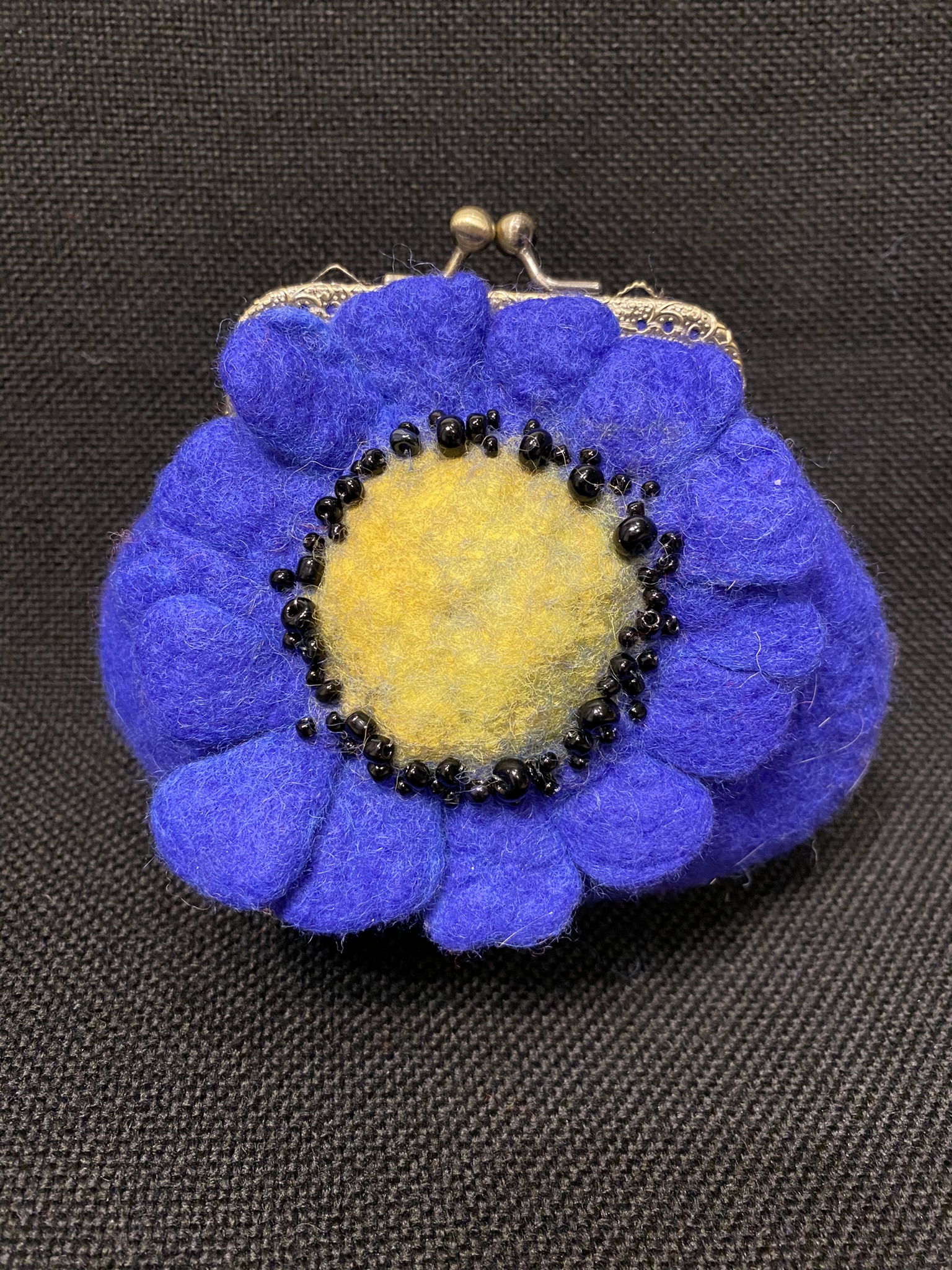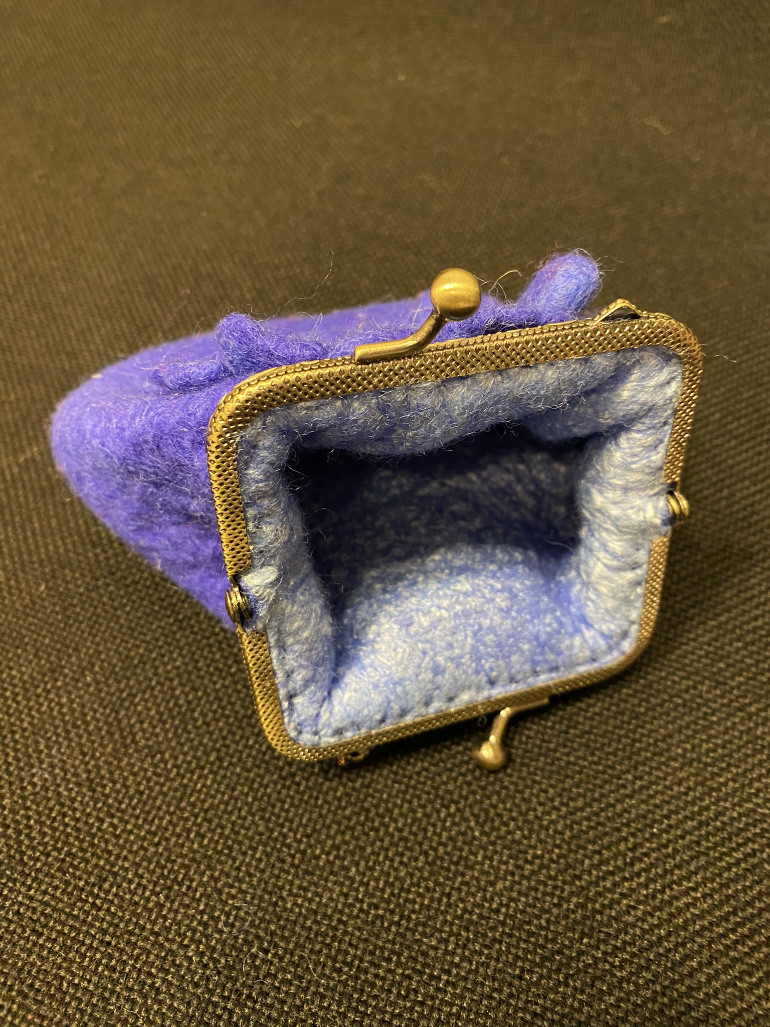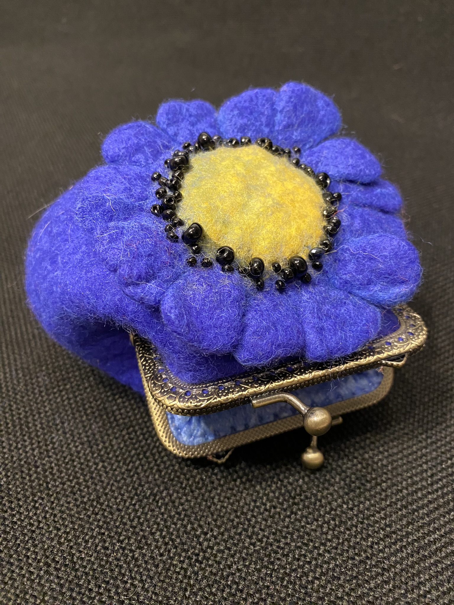 A small handmade purse made from Italian high quality merino wool, decorated with a blue flower. Antique frame 8,5 cm.