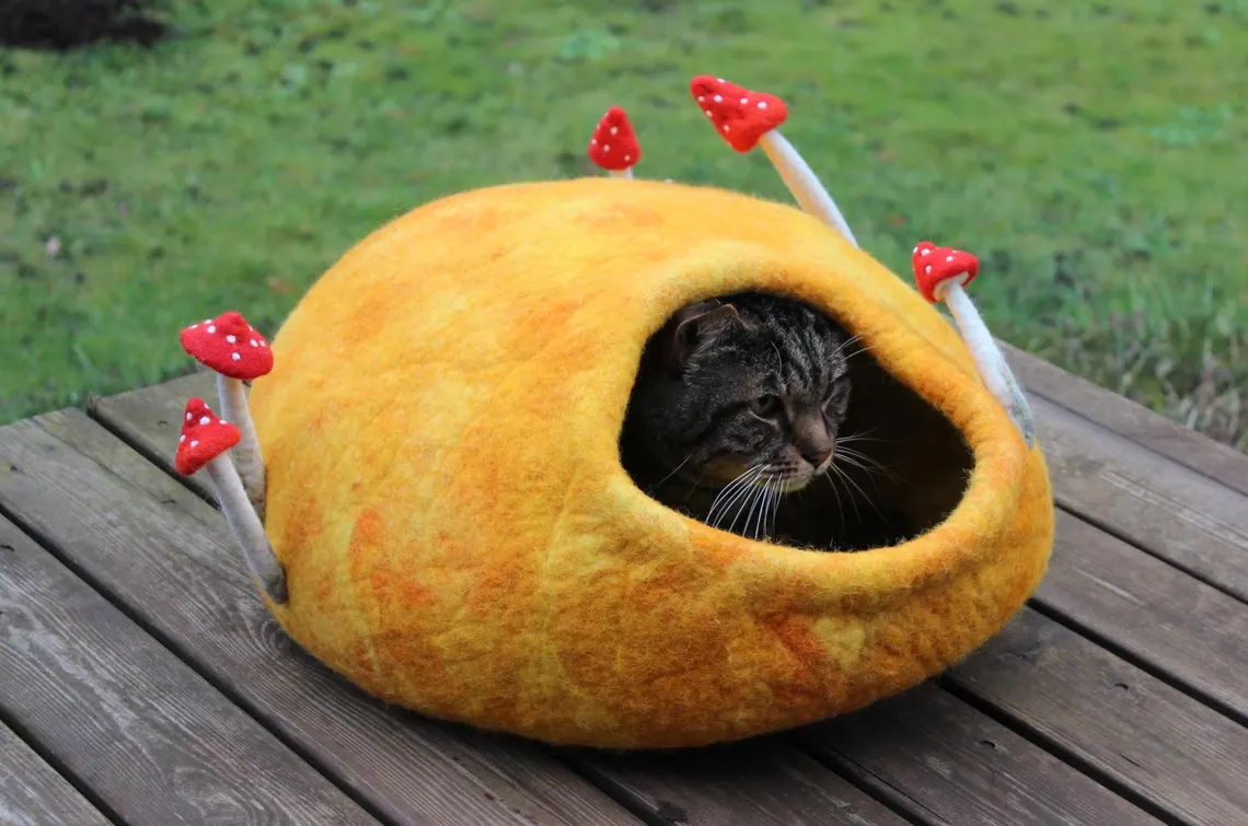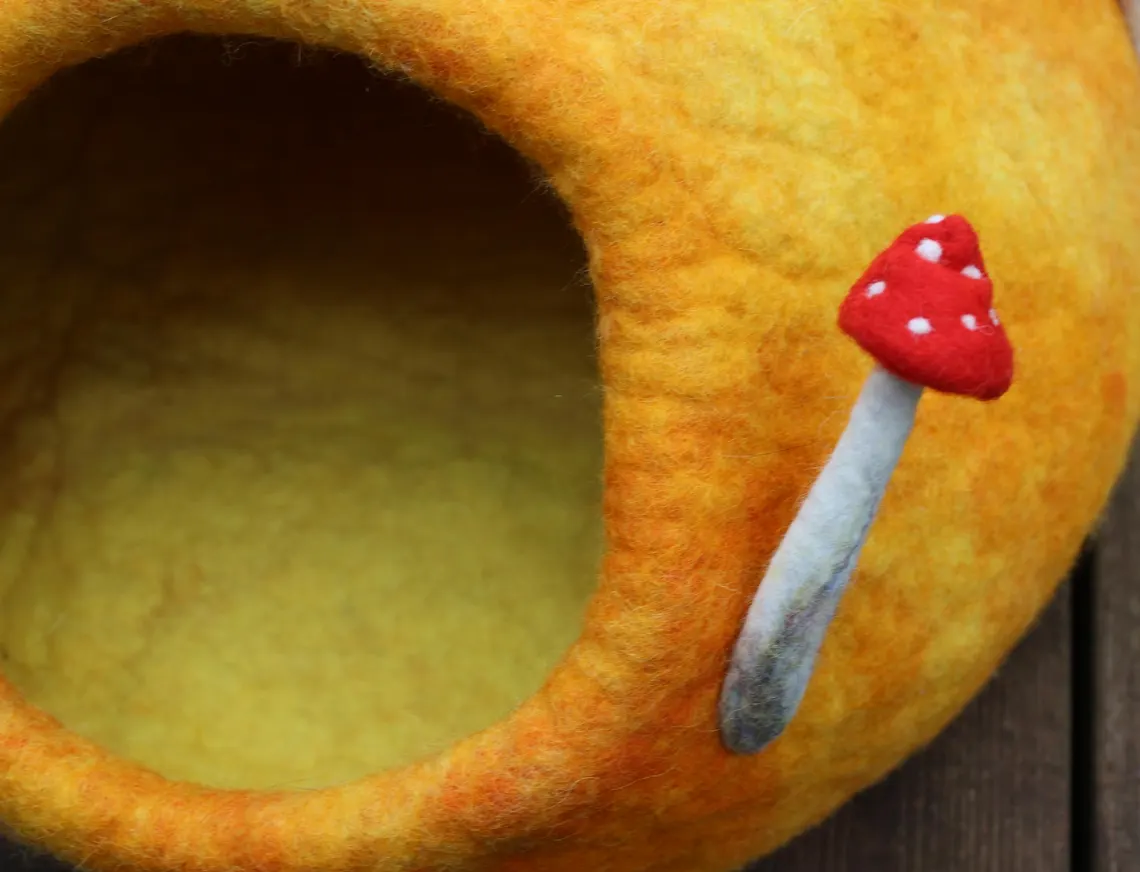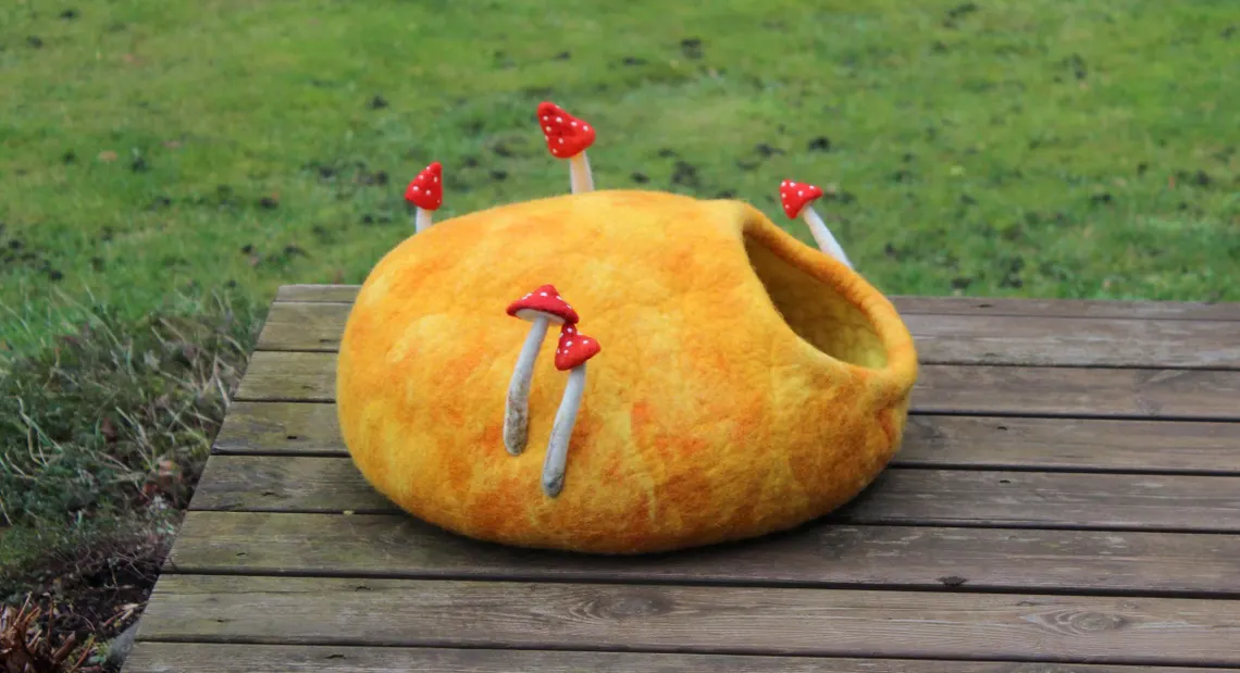 Hand-made felted cat’s house, orange colour, made from merino wool with wet felting technics.