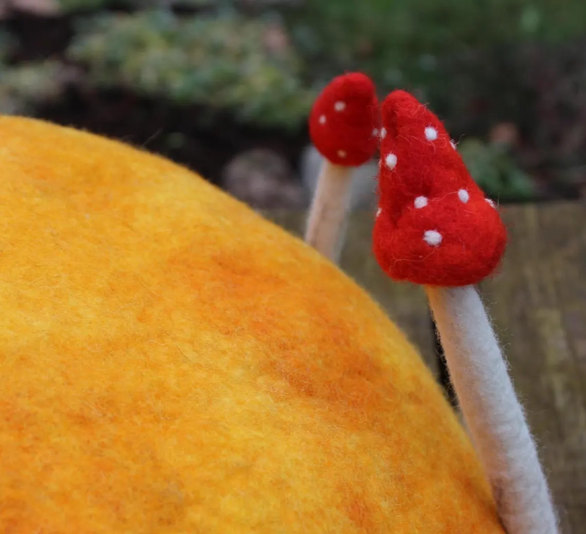 Hand-made felted cat’s house, orange colour, inside colour – yellow, decorated with five felted amanitas, bottom’s diameter 41cm, hole’s diameter 17cm, made from merino wool with wet felting technics, very warm, tested on one cat 🙂