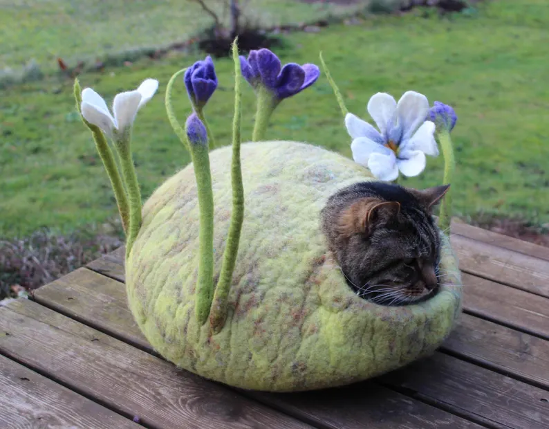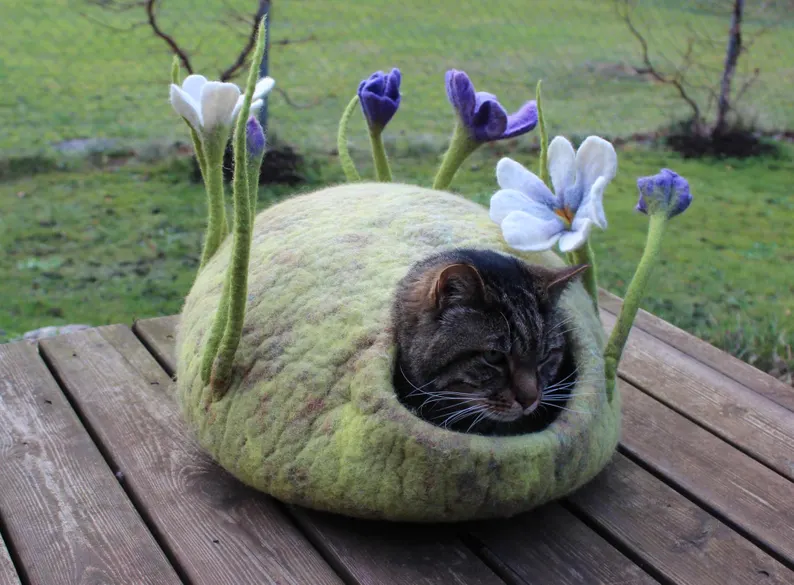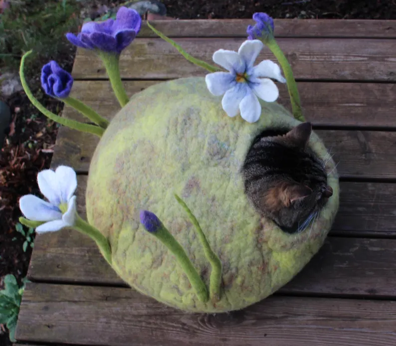 Felted cat cave made from fine merino wool, beige+light green colour, light yellow colour inside, decorated with felted flowers on green stems(20-25cm), round shape, ~39cm bottom, hole’s diameter – 15.5cm, tested on one cat 🙂