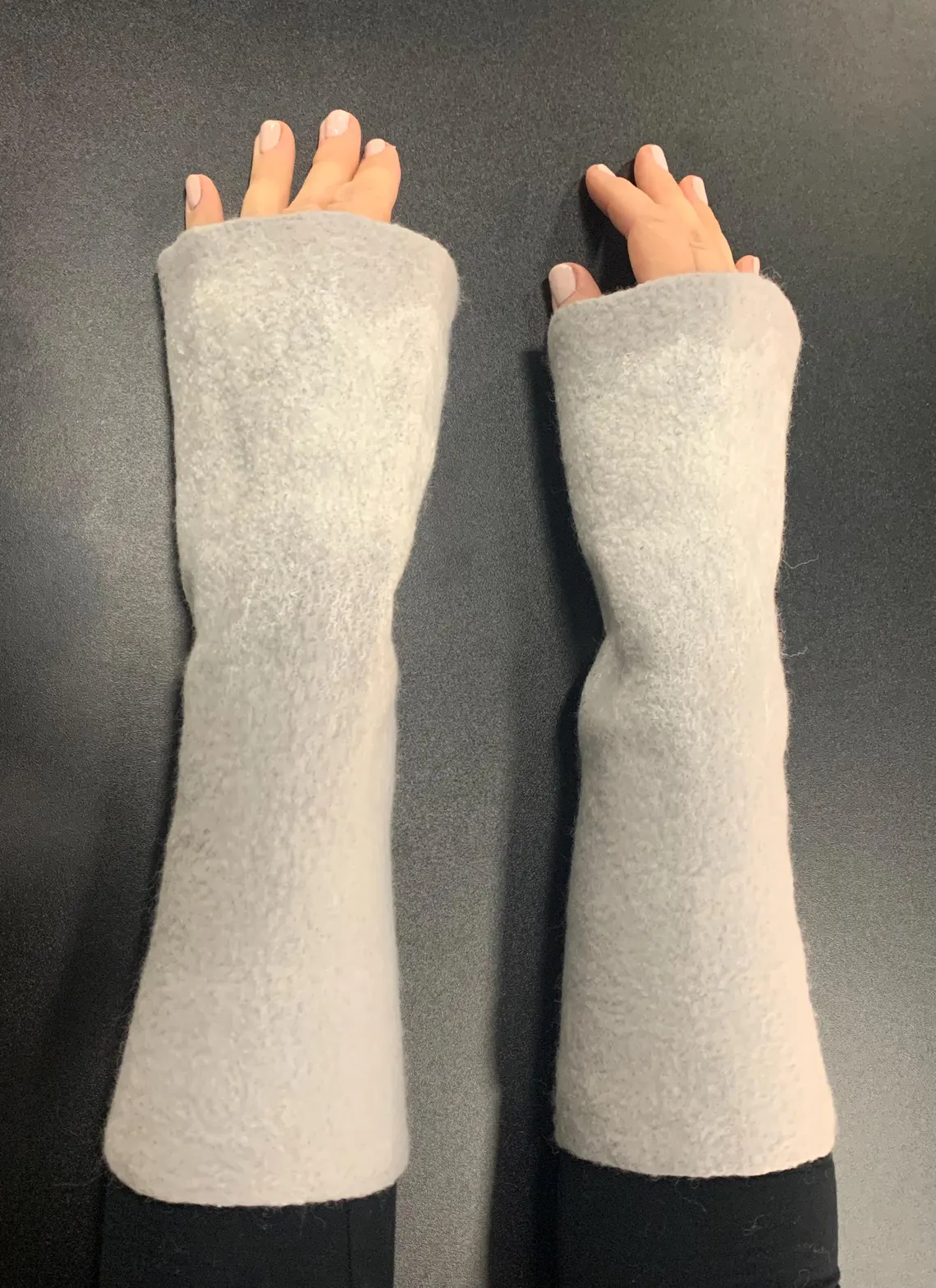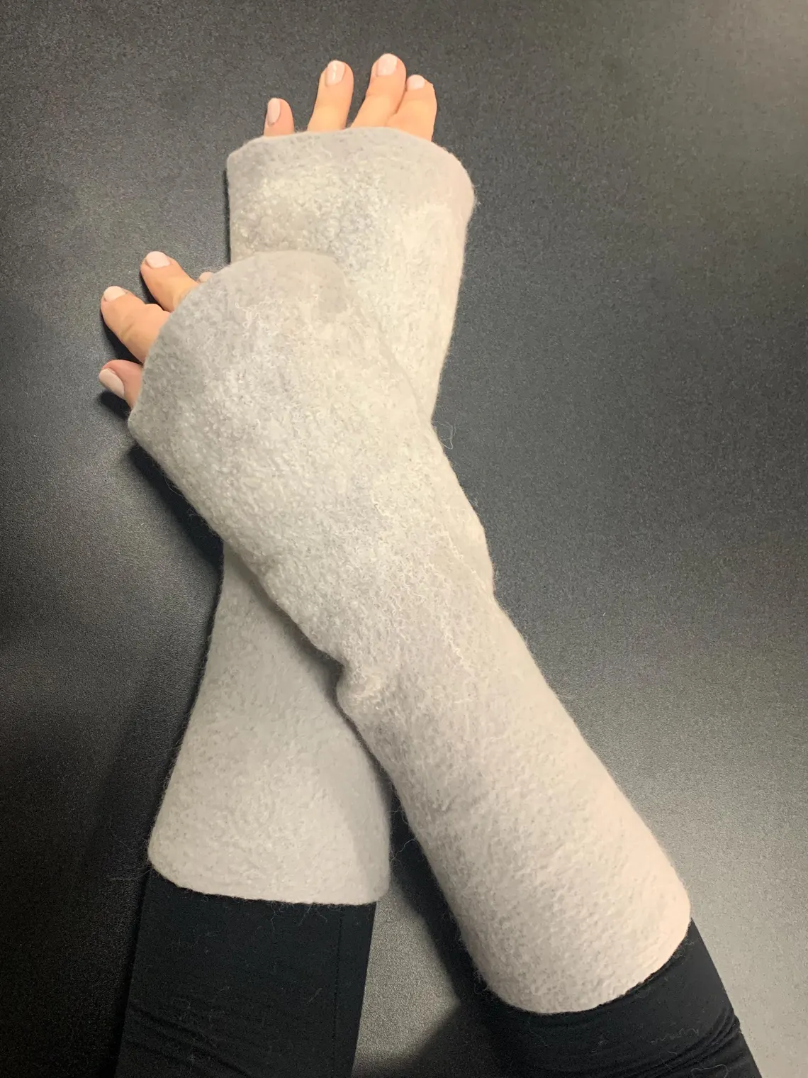 Felted arm warmers handmade from extra-fine merino wool, length 31cm, light beige colour, decorated with white viscose, warm and light.