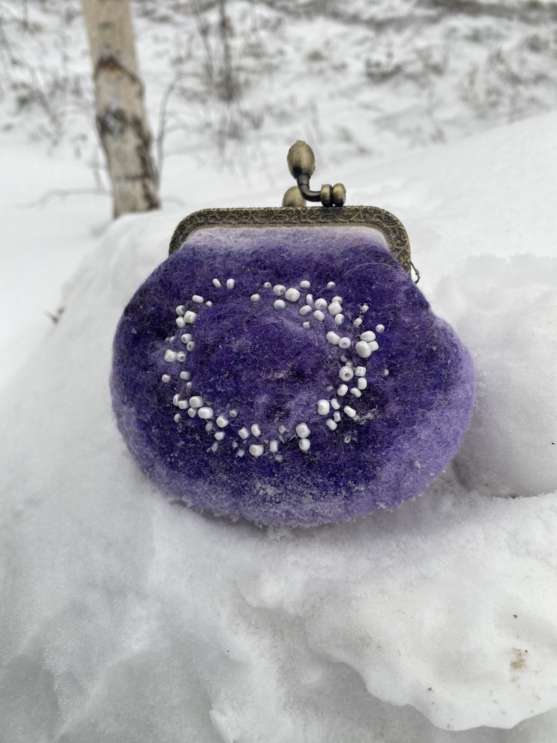 Handmade felted purse, antique 85mm frame has one hook for chain, decorated with white beads. Can be used as a purse for something very small.