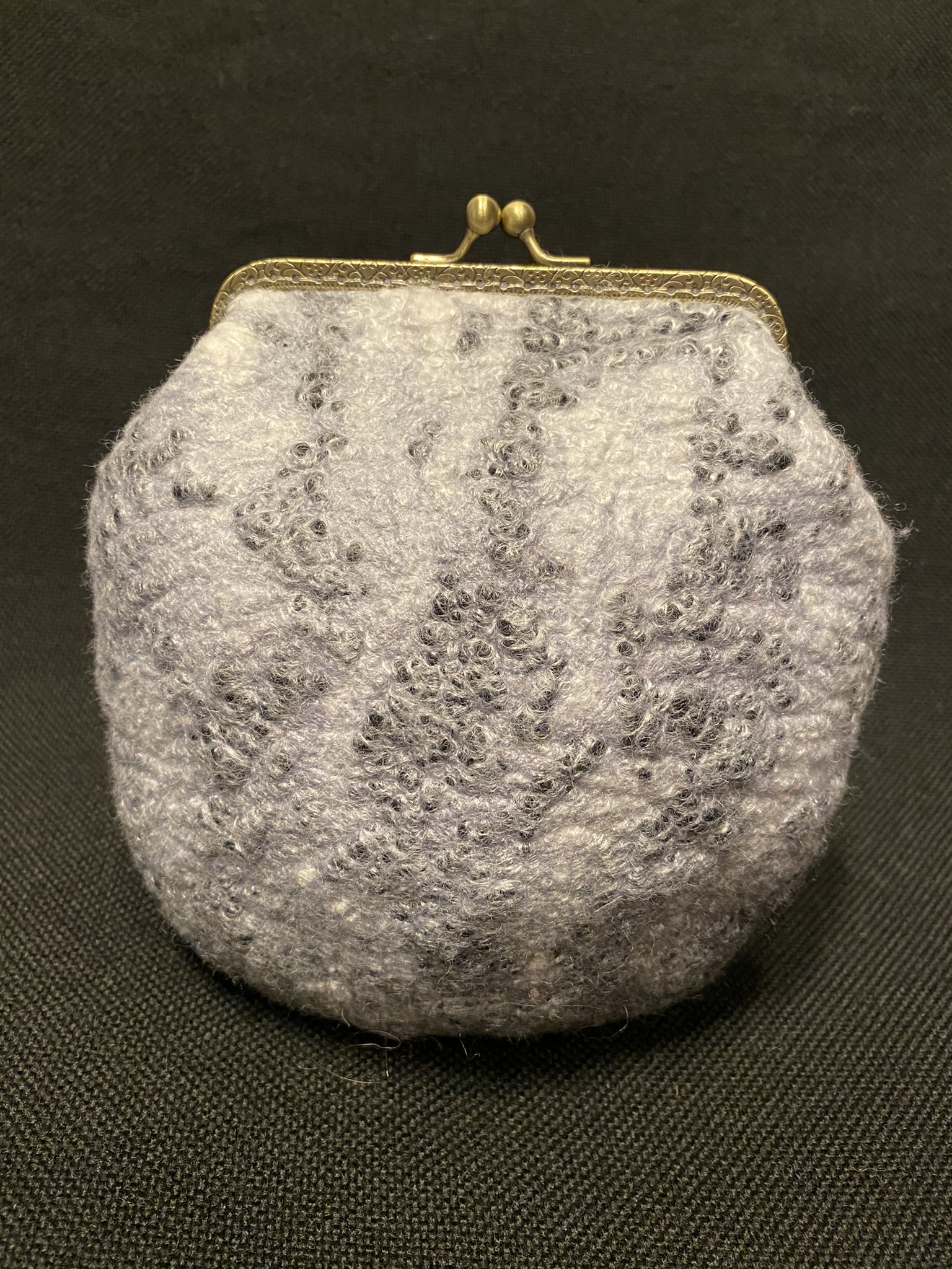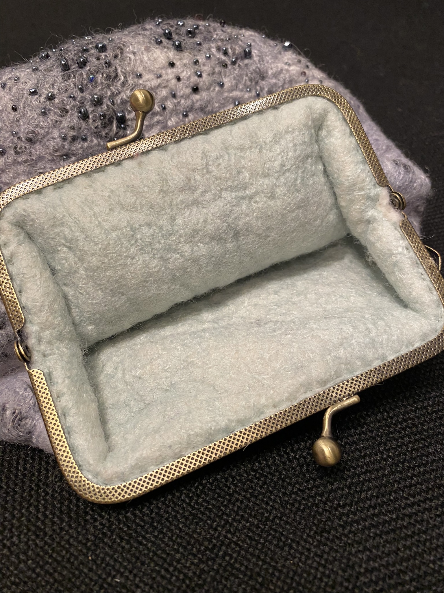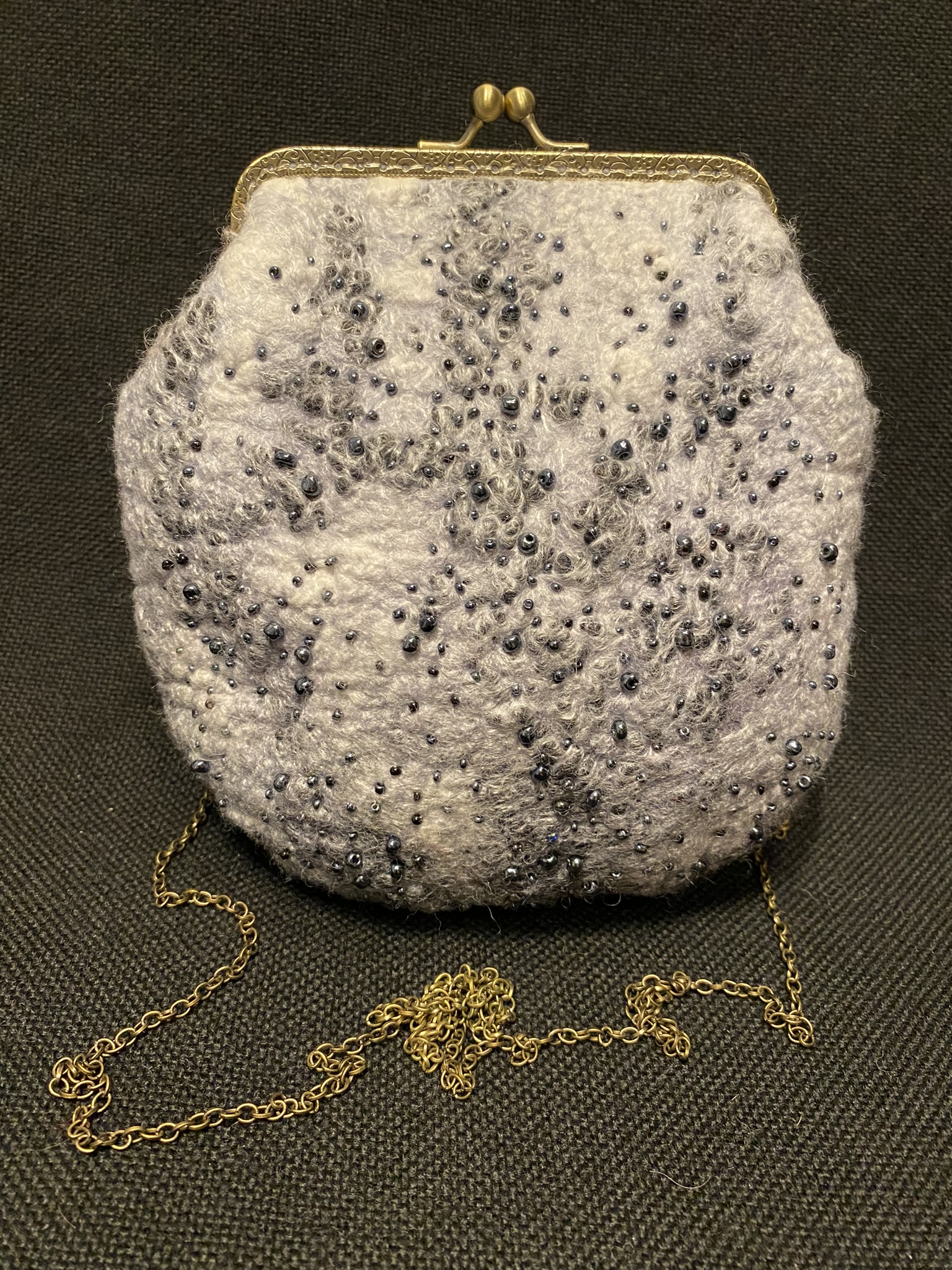 Felted handbag decorated with white viscose, black wool neps and black beads. Can be used as cosmetics bag or as accessory for evening event.