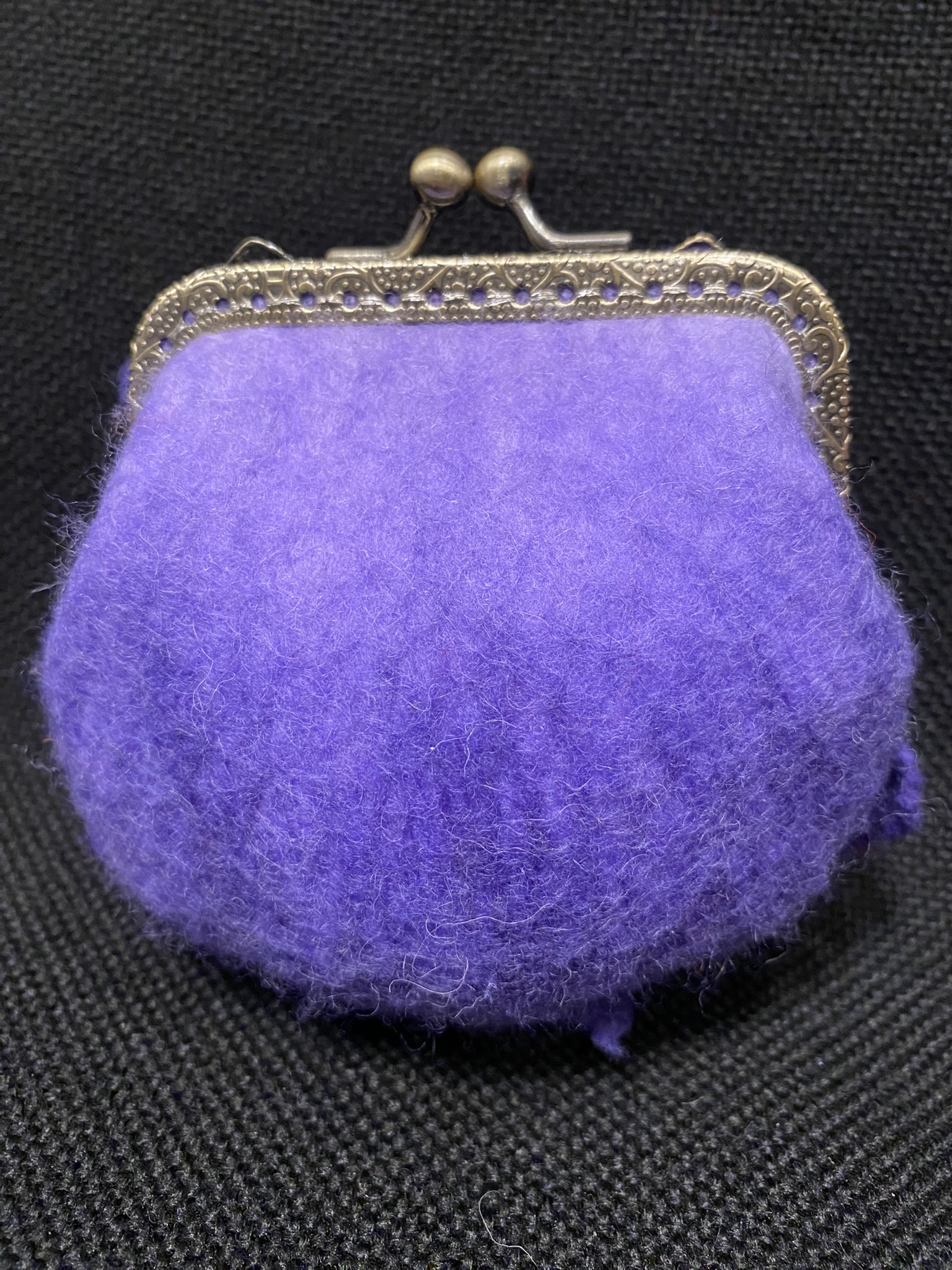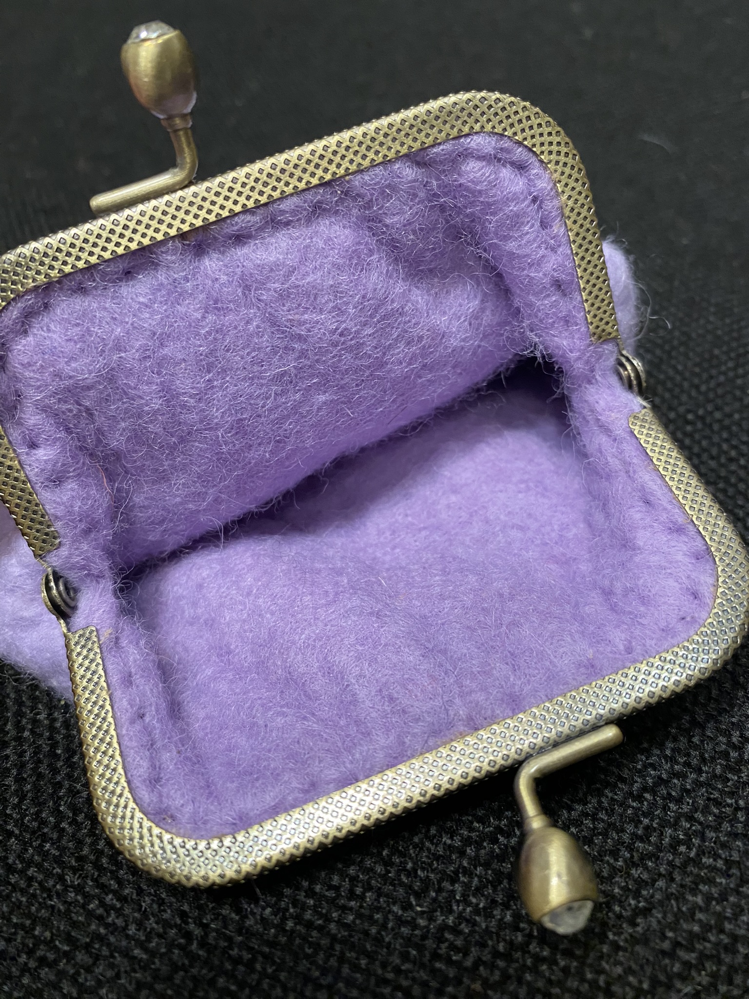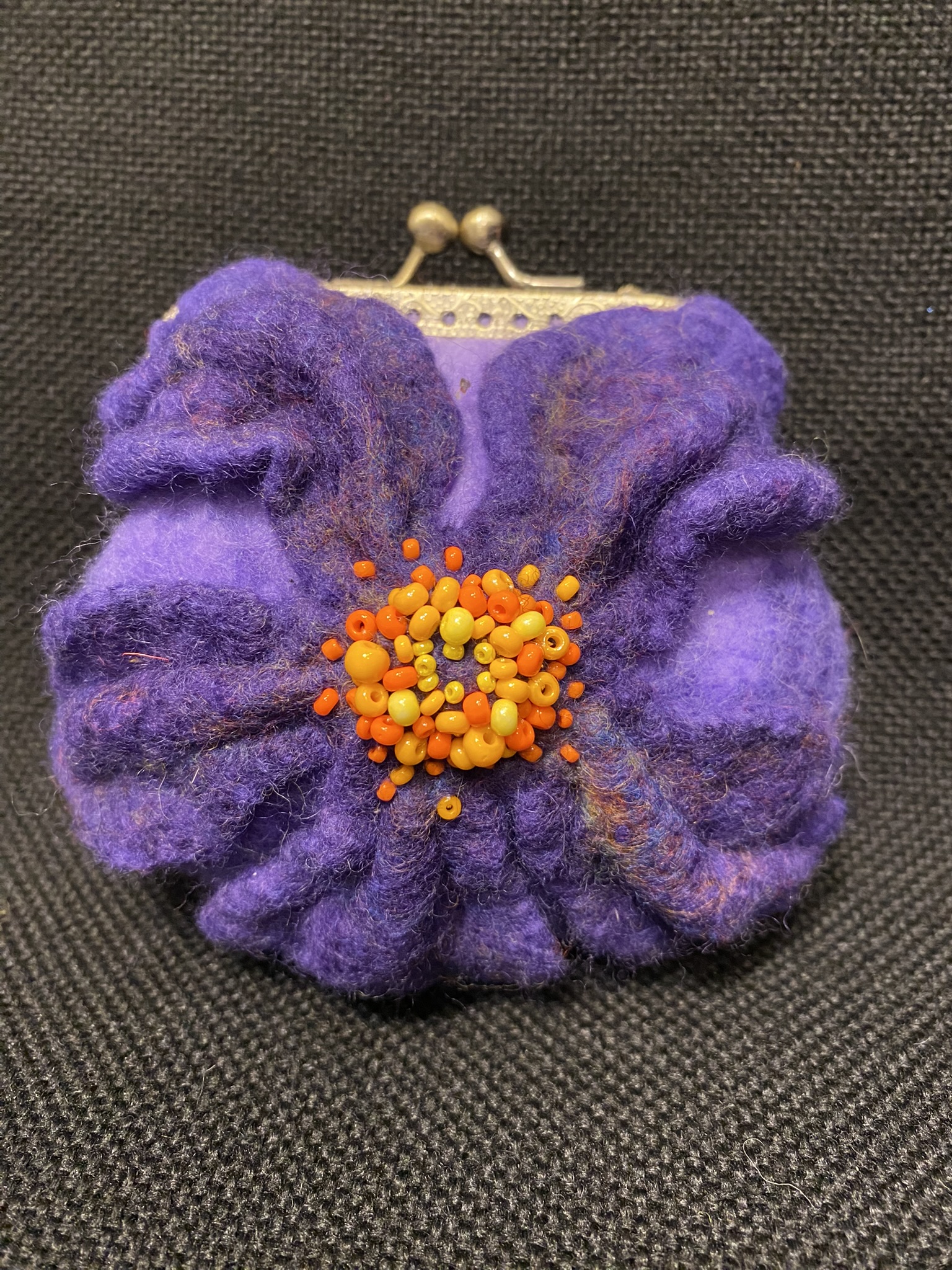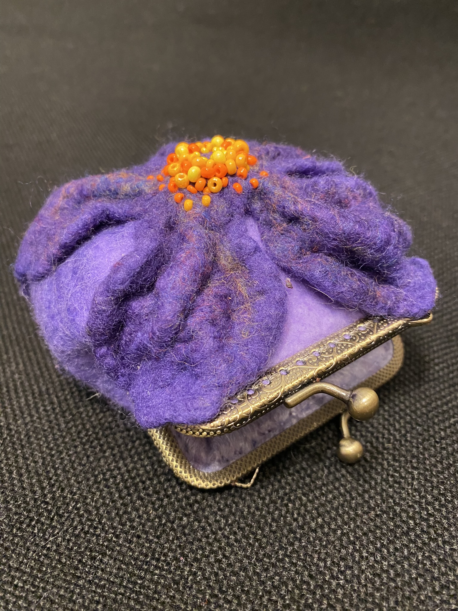 Felted handbag decorated with purple flower, orange and yellow beads. Violet colour is used for inner layer. Antique frame 8.5cm. Can be used as cosmetics bag or as wallet for coins.