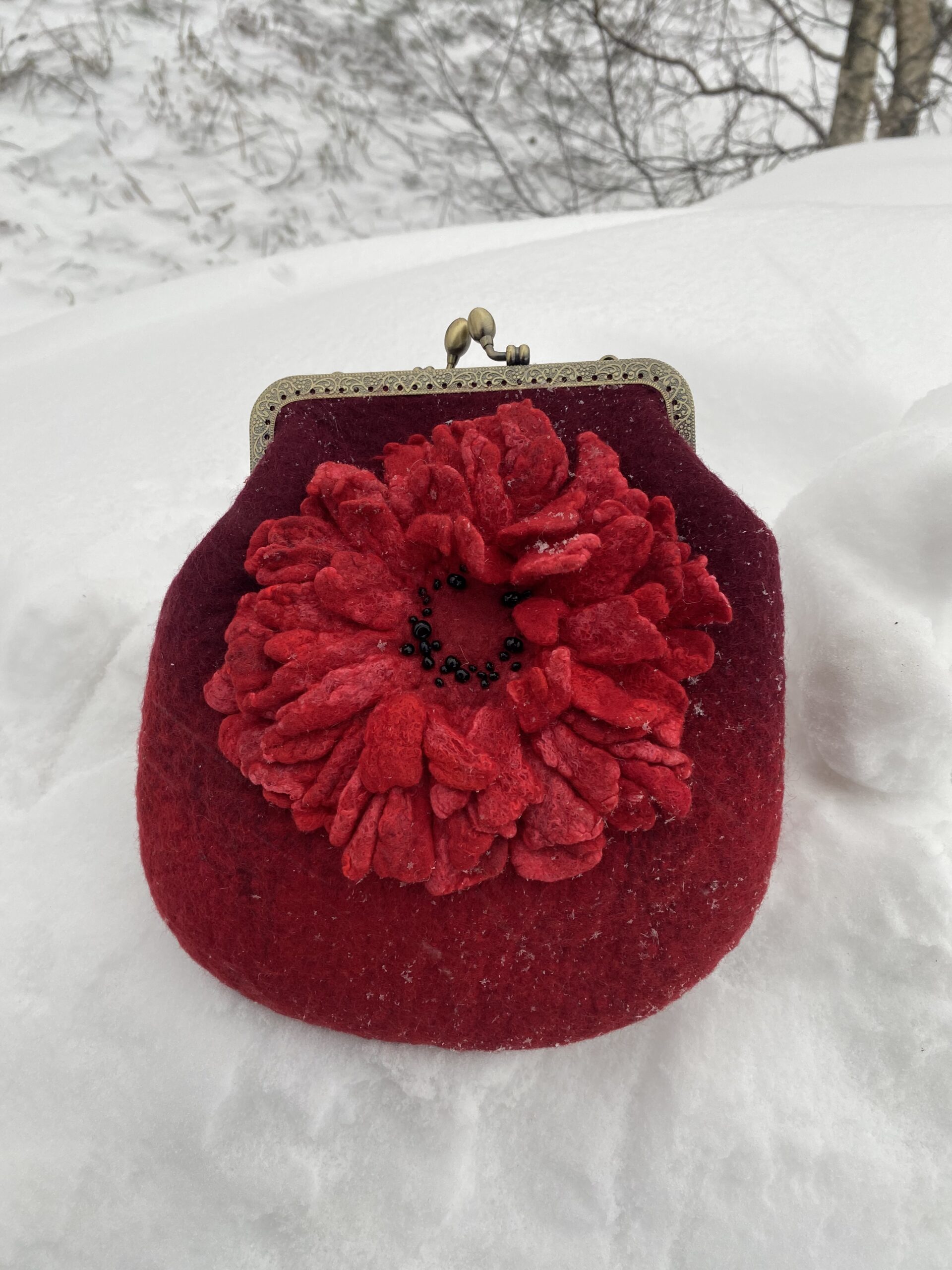 Deep red bag with chain, decorated with scarlet felted flower and black beads. Decorated with 15cm antique frame. You will definitely like it if you’re fun of red. Dark red inside.
