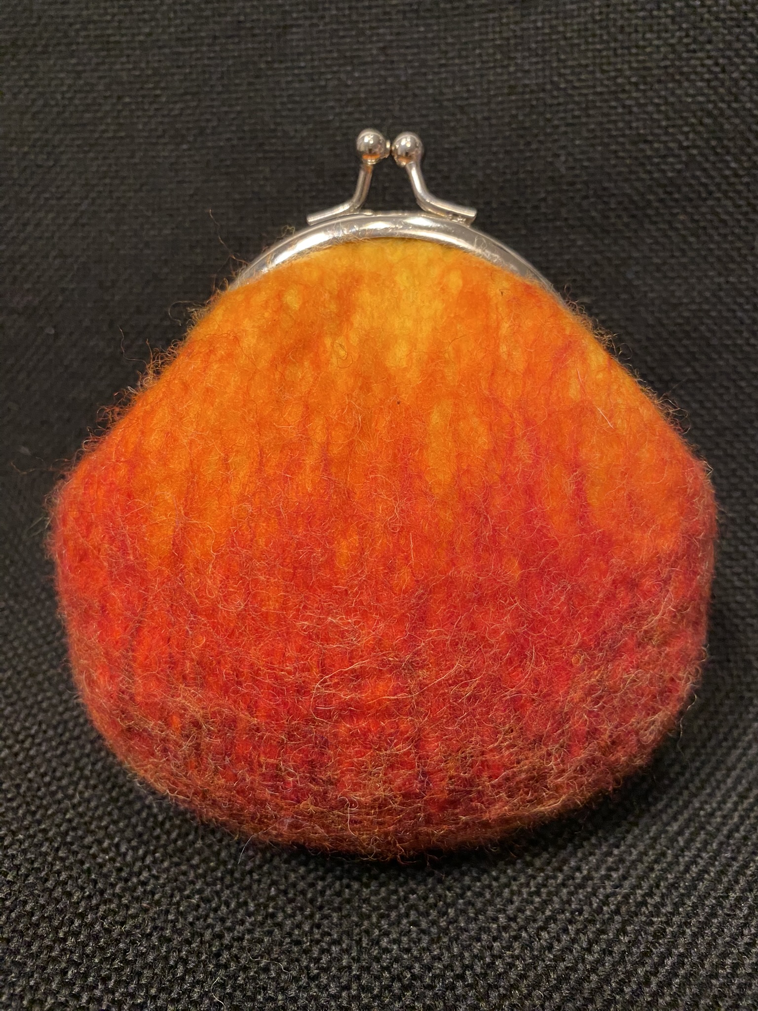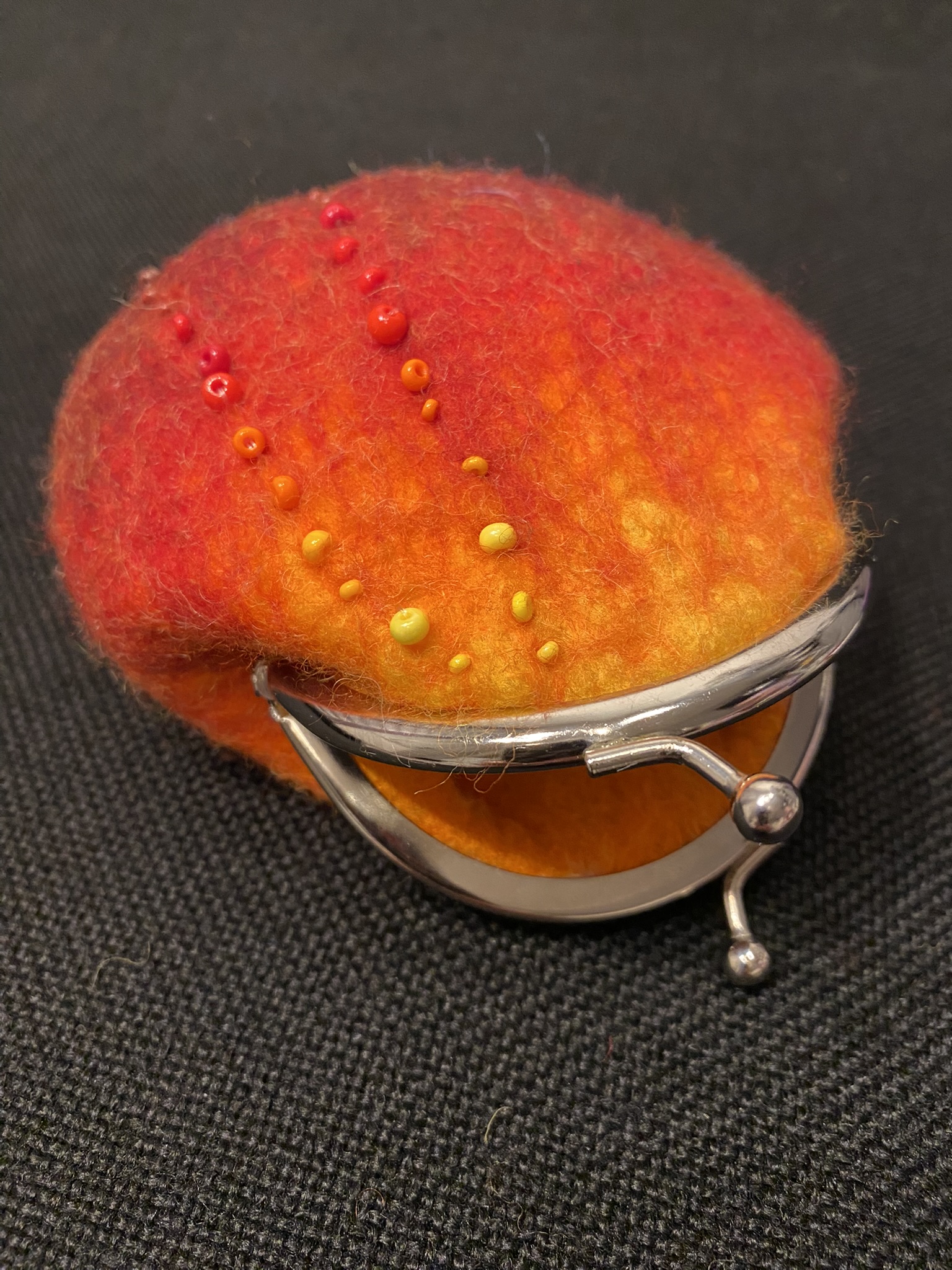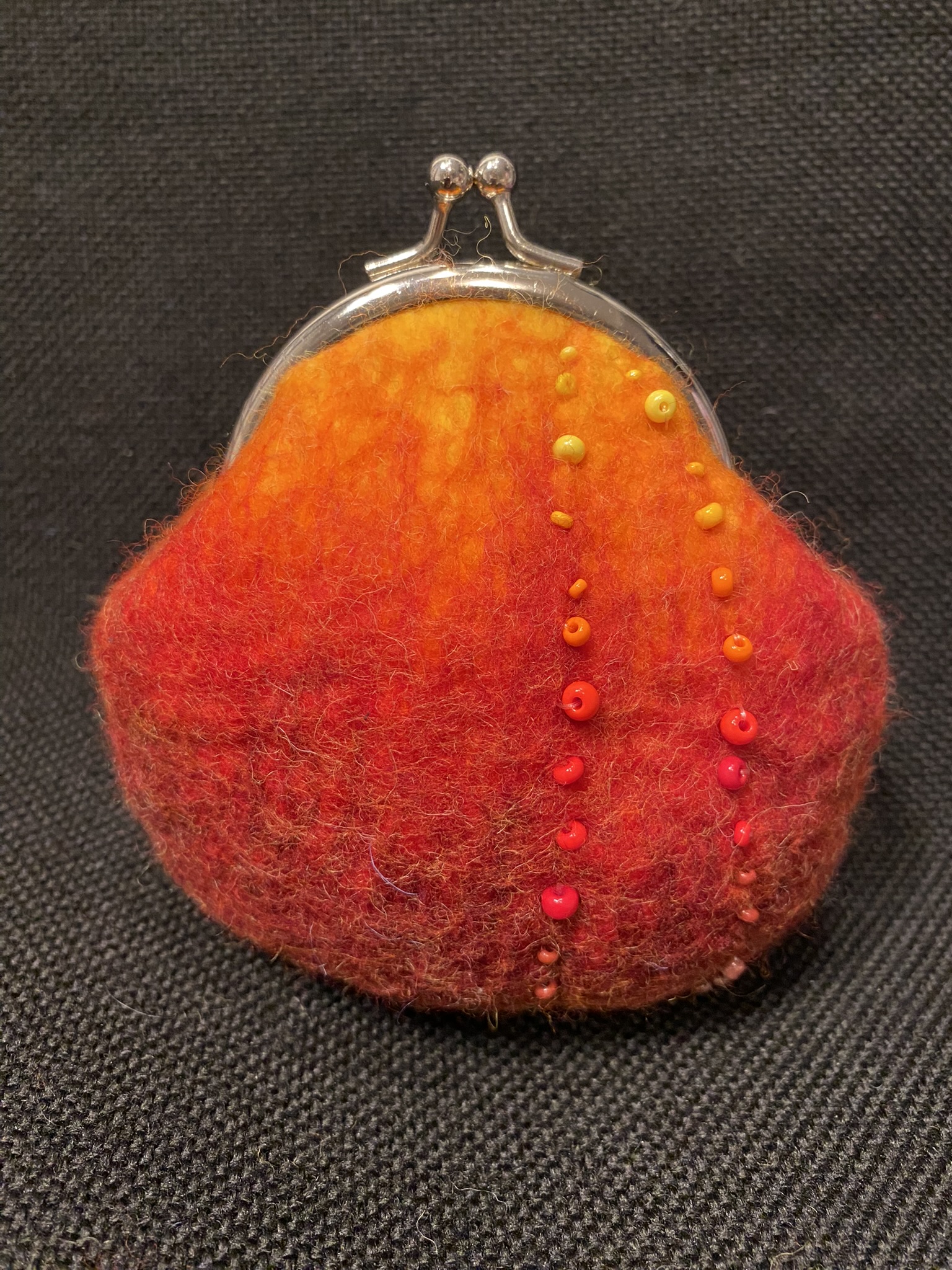 A small handmade purse made from Italian merino wool, with an inner lining of viscose fibers. It is decorated with red, orange, yellow and brown beads.